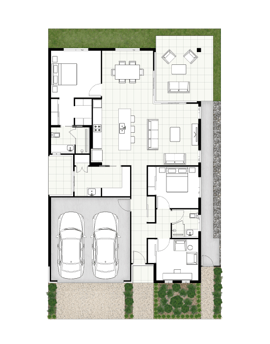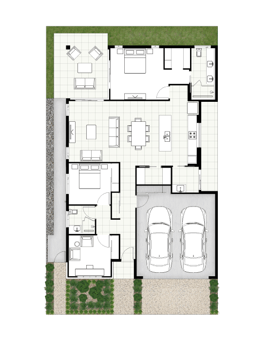 The Oceanda is a contemporary two-bedroom home designed to embrace natural light and cooling breezes that flow effortlessly through its open-plan layout. Combining refined style with thoughtful functionality, the home extends seamlessly to a generous alfresco area that connects to the kitchen and living spaces. At the heart of the kitchen lies a striking island bench and a spacious walk-in pantry, creating the perfect setting for both relaxed entertaining and everyday dining. Privately positioned, the master suite offers a serene retreat, complete with a walk-in robe and a beautifully appointed double vanity ensuite bathroom.