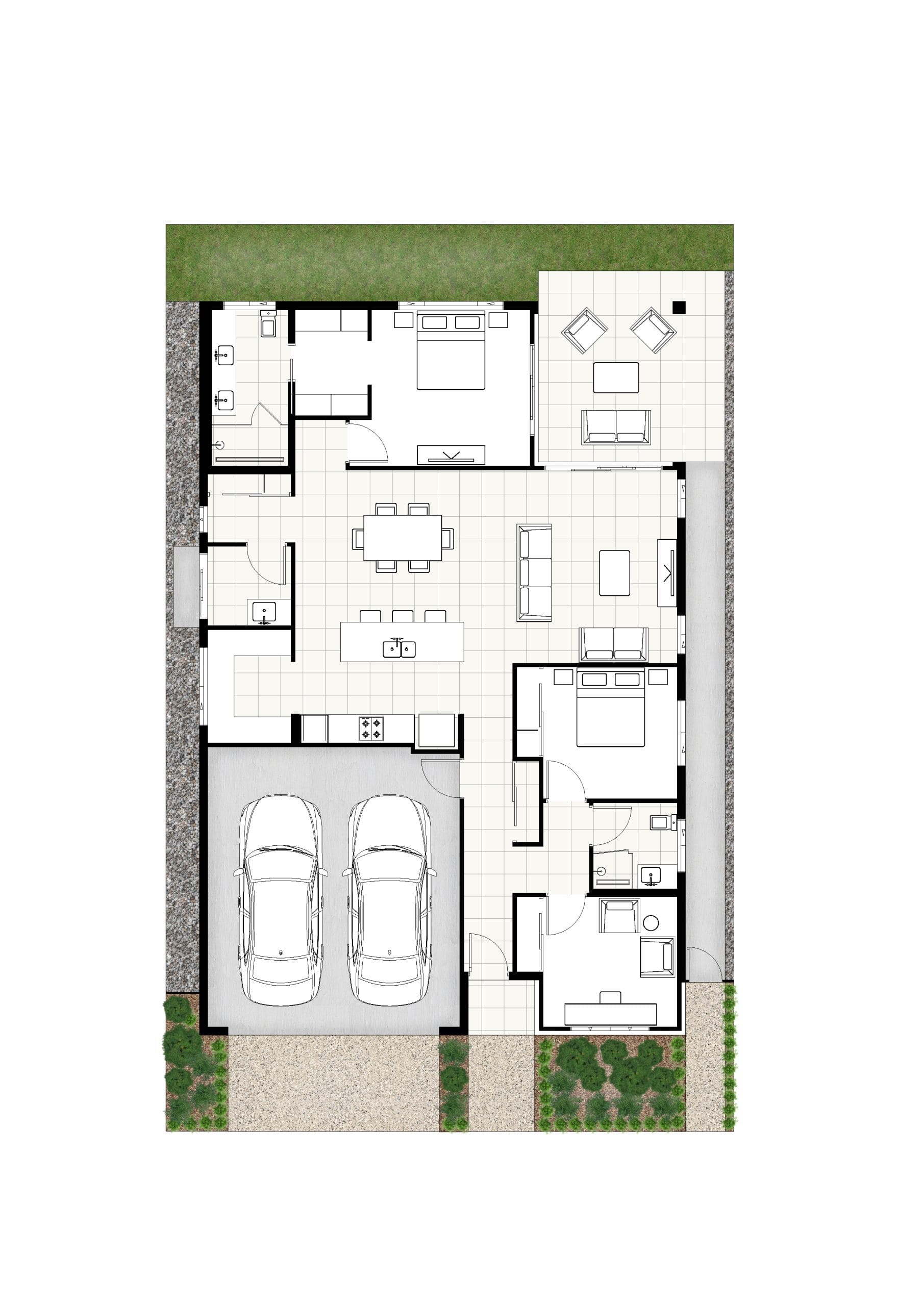 The Oceanda is a contemporary two-bedroom home designed to embrace natural light and cooling breezes that flow effortlessly through its open-plan layout. Combining refined style with thoughtful functionality, the home extends seamlessly to a generous alfresco area that connects to the kitchen and living spaces. At the heart of the kitchen lies a striking island bench and a spacious walk-in pantry, creating the perfect setting for both relaxed entertaining and everyday dining. Privately positioned, the master suite offers a serene retreat, complete with a walk-in robe and a beautifully appointed double vanity ensuite bathroom.