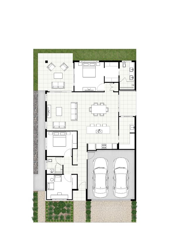 The Oceanda One is a contemporary two-bedroom home designed to embrace natural light and cooling breezes that flow effortlessly through its open-plan layout. Combining refined style with thoughtful functionality, the home extends seamlessly to a generous alfresco area that connects to the kitchen and living spaces. At the heart of the kitchen lies a striking island bench and a spacious walk-in pantry, creating the perfect setting for both relaxed entertaining and everyday dining. An additional courtyard enhances the home’s sense of openness, inviting more light and creating a peaceful spot within the home. Privately positioned, the master suite offers a serene retreat, complete with a walk-in robe and a beautifully appointed double vanity ensuite bathroom.
